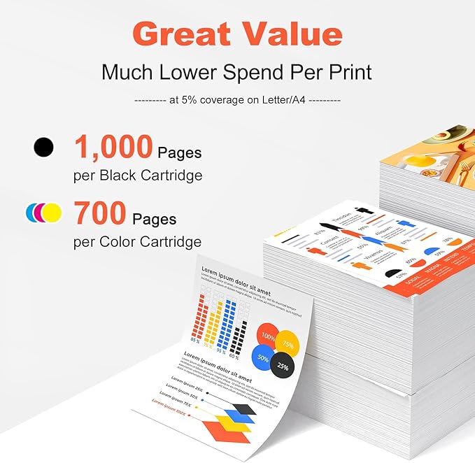 - Print more and cost less: 1,000 Pages per Black cartridge, 700 Pages per Cyan/Yellow/Magenta Cartridge at 5% coverage (Letter/A4)