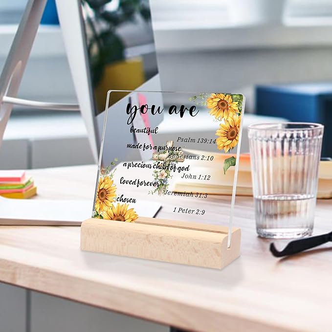 - Christian Gifts - Desk Decorative Sign: This funny clear desk decorative sign with wooden stand is the perfect christian gifts for women men. Printed with a beautiful design and meaningful text - You are beautiful Psalm 139:14 MADE FOR A PURPOSE Ephesians 2:10 A PRECIOUS CHILD OF GOD John 1:12 LOVED FOREVER Jeremiah 31:3 CHOSEN 1 Peter 2:9. As a source of inspiration and encouragement throughout the day, it can change moods and bring pleasure.