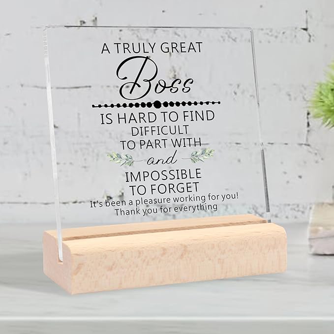 - Gifts for Boss - Acrylic Desk Decorative Sign: This funny clear desk decorative sign with wooden stand is the perfect boss gifts for women men. Printed with a beautiful design and meaningful text - A Truly Great Boss Is Hard To Find Difficult To Part With And Impossible To Forget It's Been A Pleasure Working For You! Thank You For Everything. The touching and inspiring gifts can give to the Let them know your gratitude, recognition and respect.