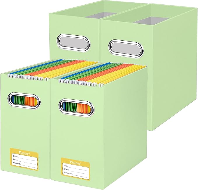 BALEINE File Organizer Box, Cardboard File Folder Organizer with Handle for Letter Size, Portable Collapsible Hanging Filing Box for Home Office Document Storage (4 Pack, Green)