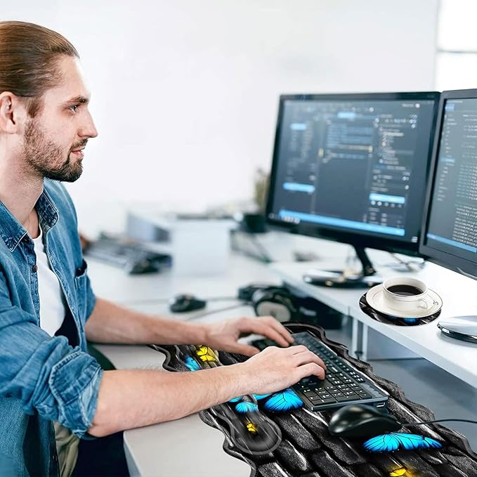 - 【4-in-1 Mouse Pad Set】 Ergonomic mouse pad includes Large desk pad(31.5×11.8 inch), Keyboard wrist rest(17.32" x 3.5" x 0.98"), Mouse wrist rest(6.8" x 3.5" x 0.98"),Cup coaster(3.9" x 3.9"). Extended desk pad which is large enough to fit a full-sized keyboard and mouse, providing plenty of space for gaming or office work, and keeping a clean, uncluttered desk.
