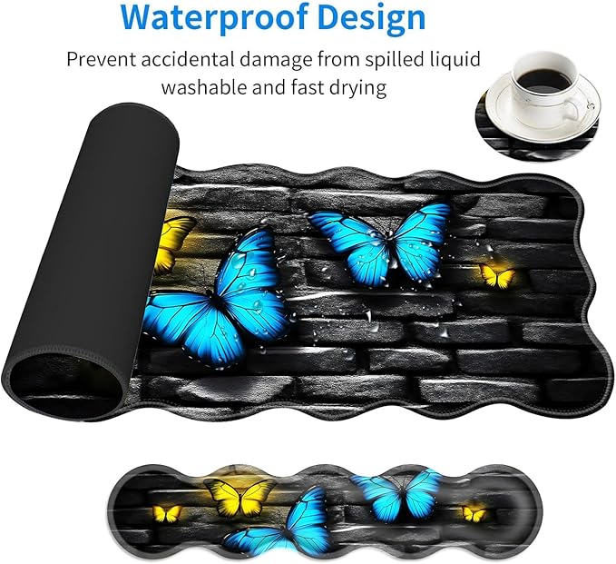 Large Mouse Pad and Keyboard Wrist Rest, Desk Pad for Keyboard and Mouse, 4-in-1 Large Gaming Mouse Pad with Wrist Support, Desk Mat for Home Office Study Game-Blue and Yellow Butterflies