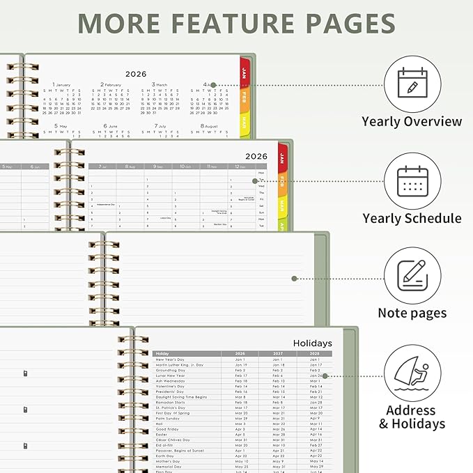 - EXTRA PAGES: 2026–2027 Yearly Overview, Yearly Plan, Yearly Schedule, 20 Note Pages, Address, 2026–2028 Holidays, US Map & Time Zone - offer comprehensive planning