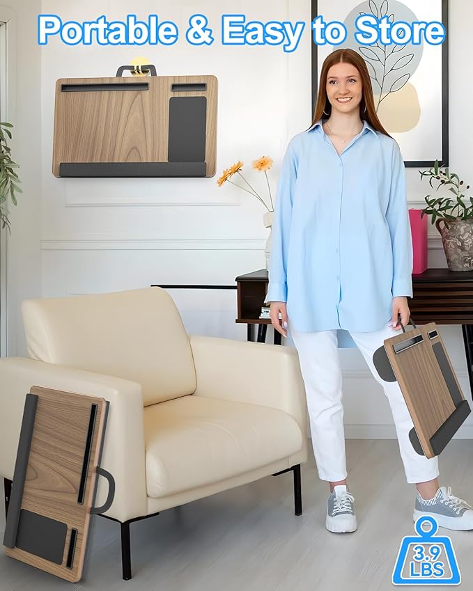 Laptop Lap Desk, Portable Large Laptop Desk for Bed, Up to 17 in Lap Table with Wrist Rest, Mouse Pad, Tablet Phone Slot, Portable Handle, Cushion (Dark Brown Woodgrain)