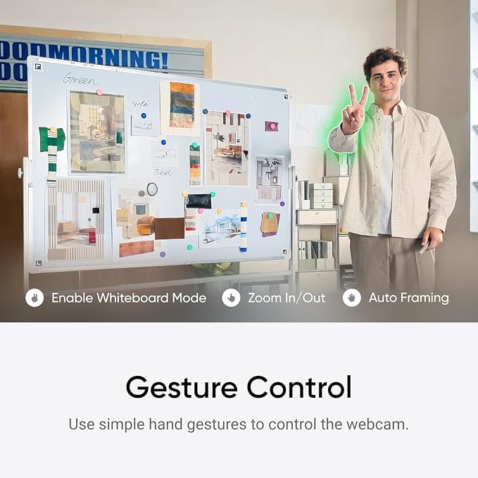 - Gesture & Remote Smartphone Control: Control your webcam remotely from your smartphone, or use simple hand gestures to start AI Tracking/Auto Framing, zoom in or out and activate Whiteboard Mode.