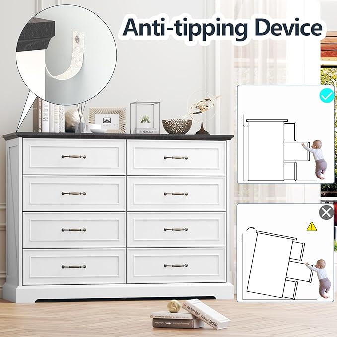 - Durable & Stable Construction: Crafted from high-density engineered wood, this sturdy dresser is built for durability. It features strong 3.5-inch legs and a 1.2" thick top that holds up to 180 lbs. For added peace of mind, an anti-tip device on the back panel keeps it secure, making this closet dresser, hallway dresser, or living room dresser both safe and reliable in any home.