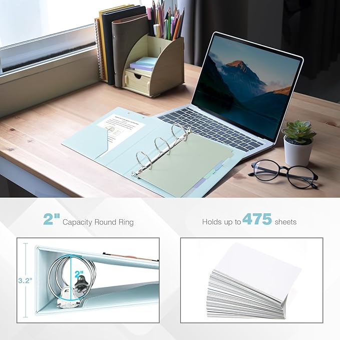 - 【Massive 2" Capacity】2-inch round rings securely hold 475+ sheets. Features dual interior pockets for documents, plus a 5-tab divider with pre-labeled stickers for instant organization.
