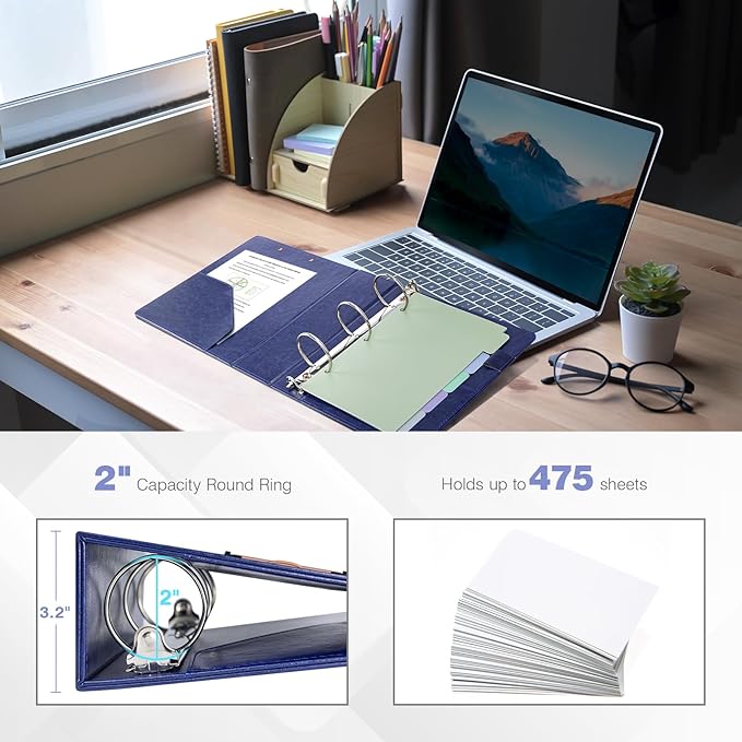 - 【Massive 2" Capacity】2-inch round rings securely hold 475+ sheets. Features dual interior pockets for documents, plus a 5-tab divider with pre-labeled stickers for instant organization.