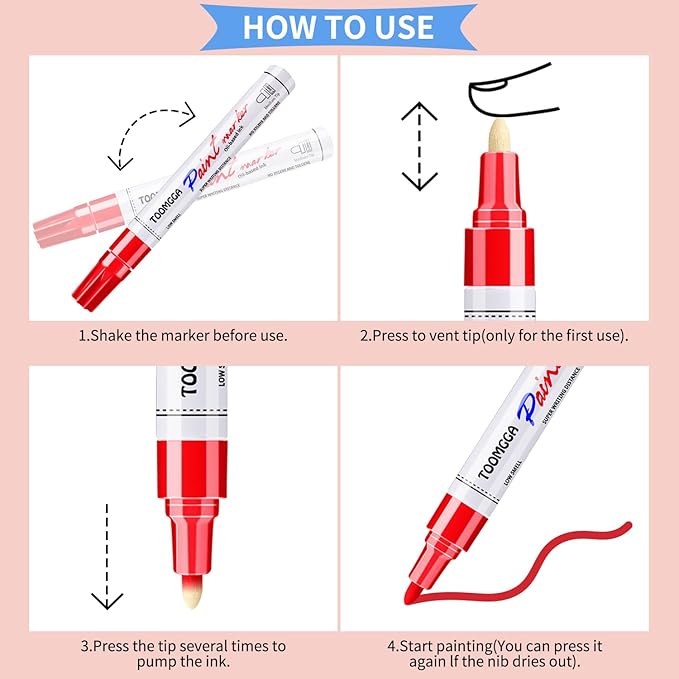 - Premium Quality: Each Red paint pens paint markers is independently tested, selected, and packaged in individual heat shrink film. Before use: Face tip upright,push against finger. Re-cap and shake. Press tip on surface several times