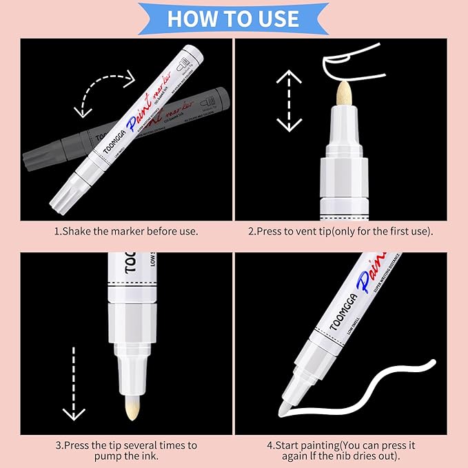 - Premium Quality: Each white paint pens paint markers is independently tested, selected, and packaged in individual heat shrink film. Before use: Face tip upright,push against finger. Re-cap and shake. Press tip on surface several times