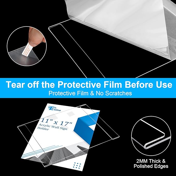 - Includes 4 Wall-Mount Acrylic Holders, Tear Tabs, and 6 Nano Adhesive Pads:This set includes 4 pack 11 ×17 wall-mounted acrylic sign holders , each pre-applied with a tear-tab sticker to help remove the protective film easily. Also comes with 6 nano double-sided adhesive pads for hassle-free, drill-free mounting on walls or glass surfaces.