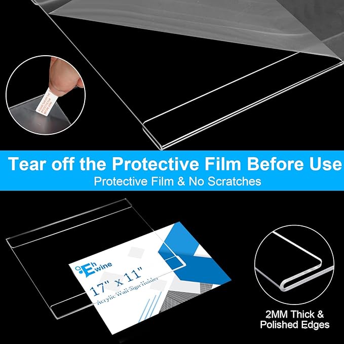 - Includes 4 Wall-Mount Acrylic Holders, Tear Tabs, and 6 Nano Adhesive Pads:This set includes 4 pack 11 ×17 wall-mounted acrylic sign holders , each pre-applied with a tear-tab sticker to help remove the protective film easily. Also comes with 6 nano double-sided adhesive pads for hassle-free, drill-free mounting on walls or glass surfaces.-free, drill-free mounting on walls or glass surfaces.