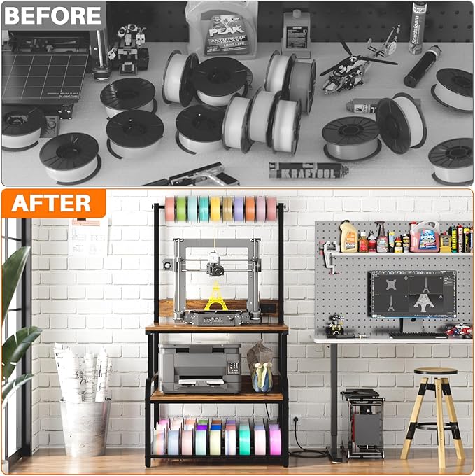 - Large Printer Stand: The spacious wooden top (29.1"L x 22.8" W) holds various 3D printers. The middle shelf supports one standard printer, enabling simultaneous operation. The lower tube rack organizes multiple filament spools, eliminating desk clutter. It securely houses two printers at once, maximizing space in any workspace.