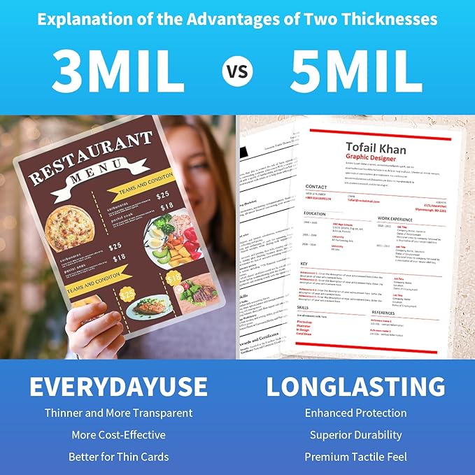 - ✅【 Extra Thickness & Durability 】:5 MIL Thick Laminating Pouches More rigid protection against bending, creasing, and frequent handling, ideal for long-term document preservation.