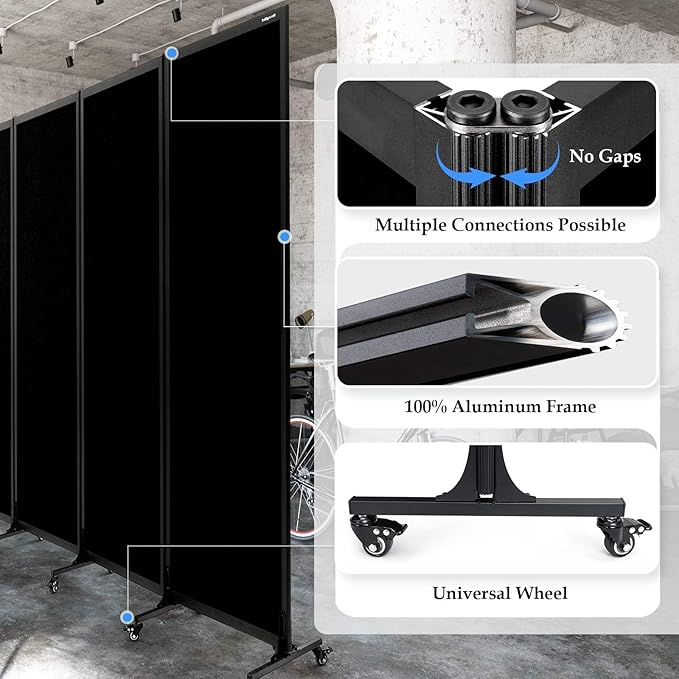 Upgrade Version Room Partition and Divider, Freestanding Rolling Dividers with Wheels,Office Privacy Screen Divider Wall,Classroom Felt Dividers,12'2"L* 6'7"H,6 Panel,Black