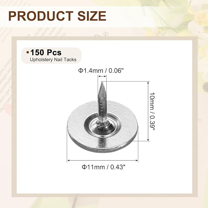 - [Size & Quantity] - The package comes with 150pcs decorative upholstery tacks. Sufficient quantity to meet your different daily needs. The overall size of upholstery nails is about 11mm x 10mm/0.43-inch x 0.39-inch(D*H)