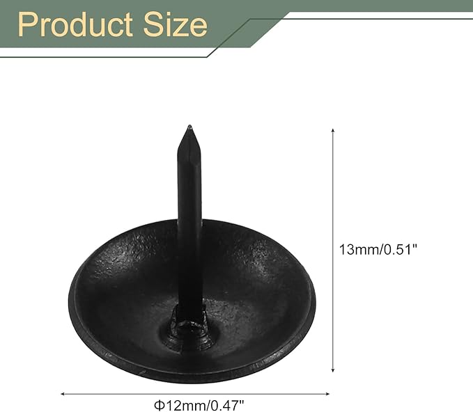 - What You Get - The package comes with 100 pieces of upholstery tacks, with the total height is 13mm/0.51inch, the head diameter is 12mm/0.47inch.