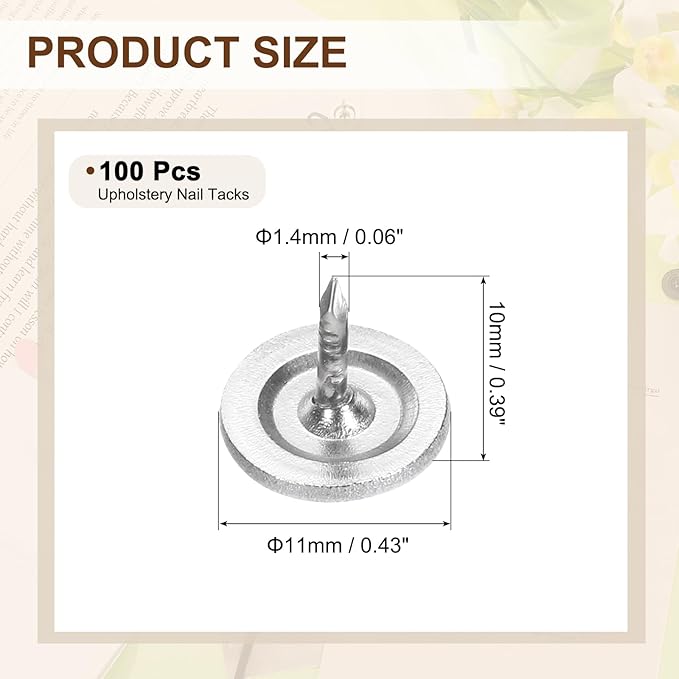 - [Size & Quantity] - The package comes with 100pcs decorative upholstery tacks. Sufficient quantity to meet your different daily needs. The overall size of upholstery nails is about 11mm x 10mm/0.43-inch x 0.39-inch(D*H)