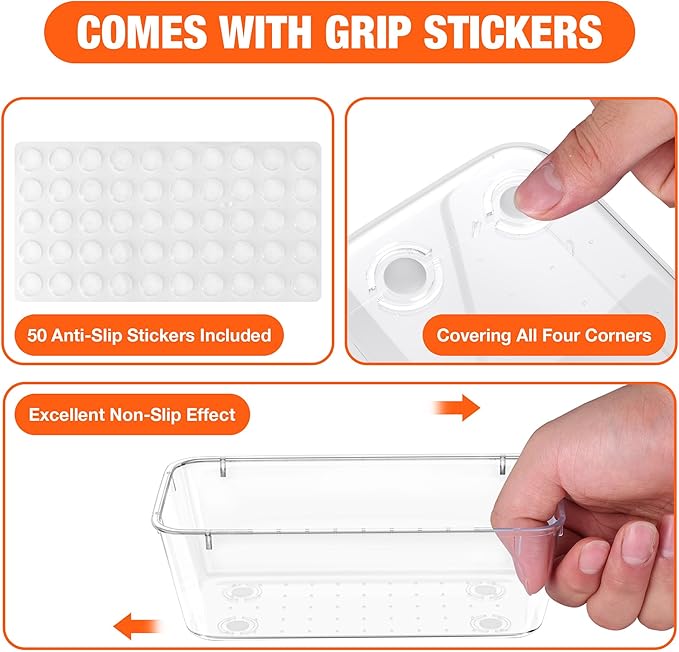 - Anti-Slip Design: Our bathroom drawer organizers have anti-slip spots inside and come with 50 anti-slip stickers that can be applied to the four corners of the base. Whether opening or closing the drawer, the plastic drawer organizers stay firmly in place