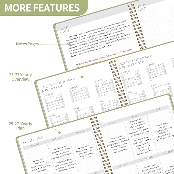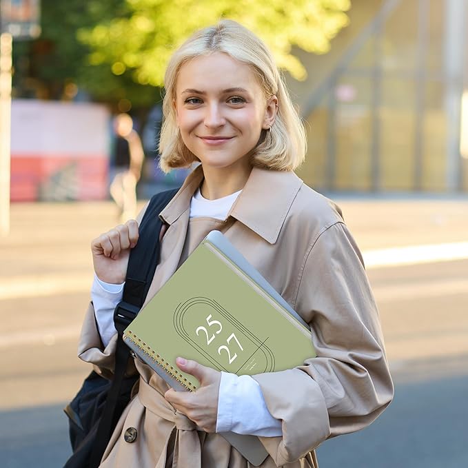 - Stylish Design: Our 2025-2027 Monthly Planner features a sleek and elegant green cover with "25-27" prominently displayed in the center, making it a fashionable addition to your workspace.