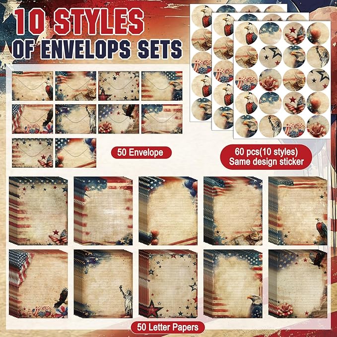 - Retro Independence Day Paper Stationery Set: you will receive 50 stationery paper and envelopes letter sets, including 50 pieces of letter writing papers, 50 matching envelopes with 60 dot stickers; The sufficient quantity and rich designs cover your writing and sending needs