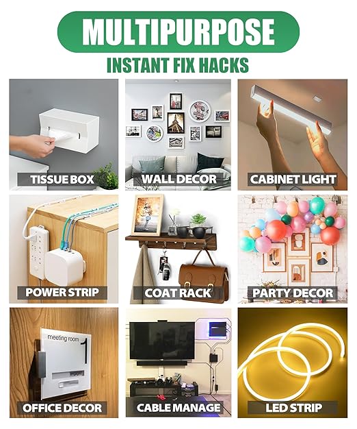 - ✅ VERSATILE APPLICATIONS – Great for home, office, classroom or outdoor projects. Use it on smooth walls, wood, metal, glass, or even fabrics and carpets. Hang photos, posters, LED lights, hooks, phone mounts and more. For best results, ensure the surface is clean, dry and free of dust or grease before applying, then press the tape firmly along its entire length for maximum hold.