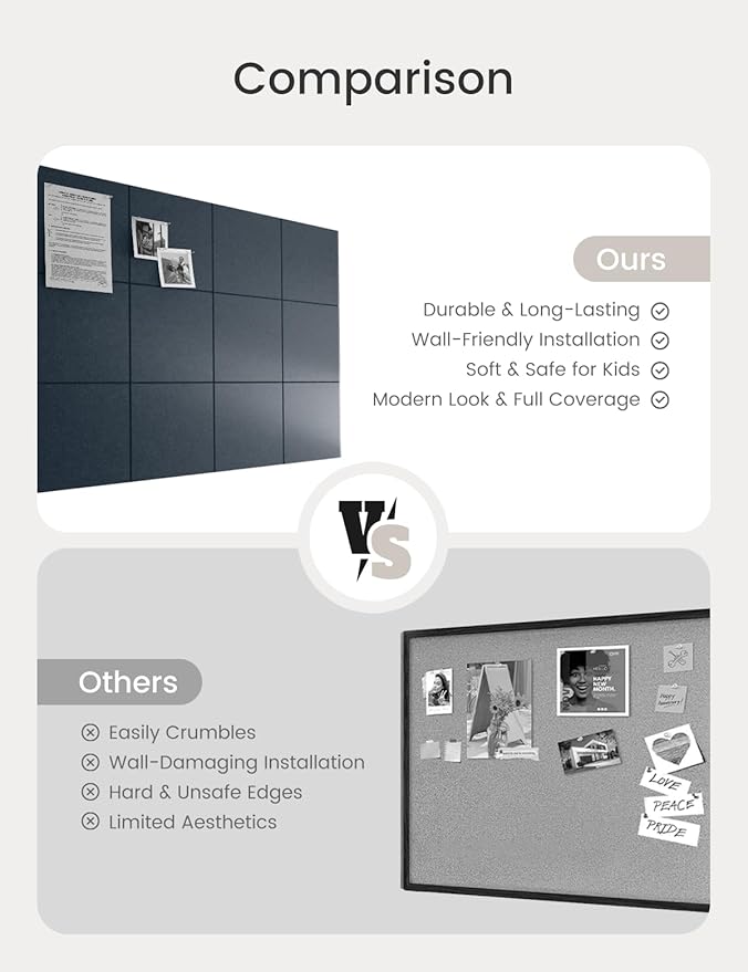 - 【Felt Bulletin Board – 12 Tiles Included】 Includes 12 felt cork boards (each 11.8" x 11.8") with 30 Pushpins that can be freely arranged into a large display board. Perfect for showcasing your schedules, ideas, and creations in home or office settings.