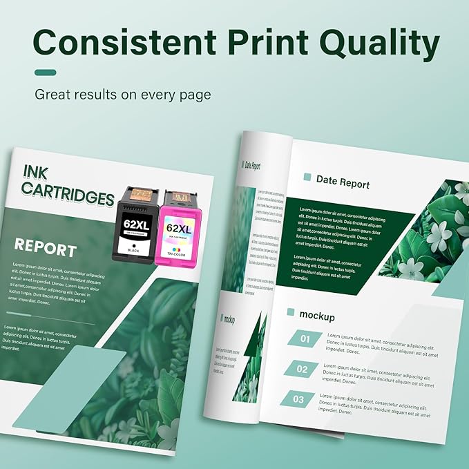 - High Page Yield: It yields up to 750 pages for each 62XL 62 Black Ink and 450 pages for each 62XL 62 tricolor high yield ink cartridges at 5% coverage (A4e letter)