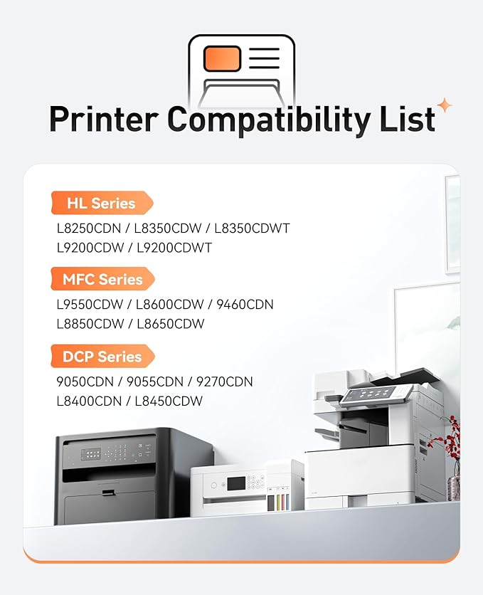 - Compatible Printers: Compatible with Brother DCP-9050CDN,DCP-9055CDN,DCP-9270CDN,DCP-L8400CDN,DCP-L8450CDW Series Printer; HL-L8250CDN,HL-L8350CDW,HL-L8350CDWT,HL-L9200CDW,HL-L9200CDWT Series Printer; MFC-L9550CDW,MFC-L8600CDW,MFC-9460CDN,MFC-L8850CDW,MFC-L8650CDW Series Printer.