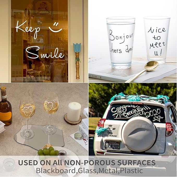 - MULTIPURPOSE USE: From chalk pencils for chalkboards to window paint markers, these versatile pens adapt to all your creative needs. Ideal for decorating car windows or adding flair to acrylic board displays.