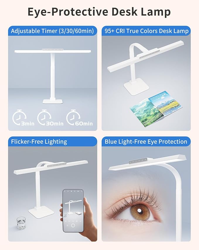 - Simple & Sensitive Control: Elevate your workspace with this smart touch desk lamp featuring auto-dimming technology that adapts to ambient light. Effortlessly adjust color temperature (3000K-6000K) and brightness (10%-100%) via the touch panel. The built-in memory function saves your preferences, while its sleek design makes it the perfect table lamp for desk setups