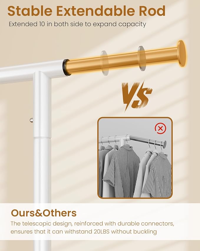 - šššššæš š¼ššæ ššš¼š½šš š¾ššššššš¾šššš: Our clothes rack adopts an innovative one-piece rod design, which ensures that the clothing rack are evenly supported, preventing sagging or bending. The triangle on the sides and dual U-shade rods on the bottom make the heavy duty clothing rack more stable and sturdy. The rolling rack can hold up to 450 pounds, so you can hang up heavy clothing, place luggage and more without worry.