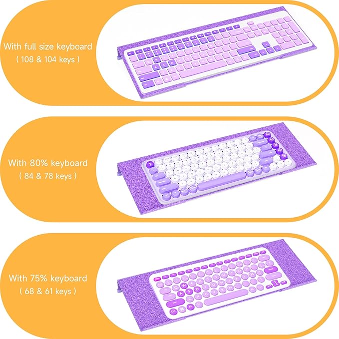 - TWO LENGTHS OPTIONAL: 17 inches wide keyboard lift is compatible with thin keyboard like magic keyboard and other 104-108 keys full-sized keyboard which does not have any elevation, 11 inches wide keyboard lifter for desk is compatible with mini keyboard wthout the number pad such as Apple keyboard, 84 keys, 78 keys, 68 keys, 61 keys, 49-51 keys compact keyboard, please check your typing keyboard measurements prior to purchase, enjoy the fun of this tilted keyboard tray