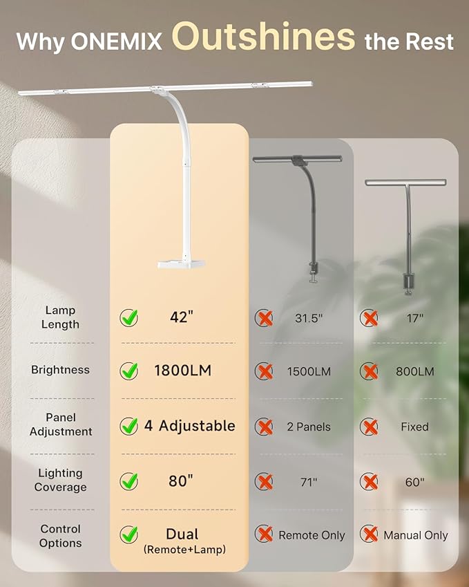 ONEMIX 42" LED Desk Lamp for Home Office, Eye-Caring Desk Light with Adjustable 4-Segment Bar, 1800LM Bright, Remote, Architect Table Lamp with Base for Dual Monitors, Reading, Study, Workbench(White)