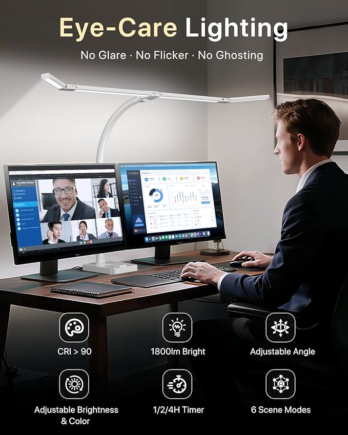 - Ultra-Wide & Super-Bright Light Bar: This 42-inch LED desk lamp features a 4-segment architect-style light bar with independently rotatable panels. Fold the segments inward for focused, task-oriented lighting—or swivel them outward to blanket up to 80 inches of workspace in wide, even illumination. With 1800 lumens of flicker-free brightness, it’s ideal for dual monitors, puzzle tables, sewing setups, and creative workspaces in home offices or dorms.