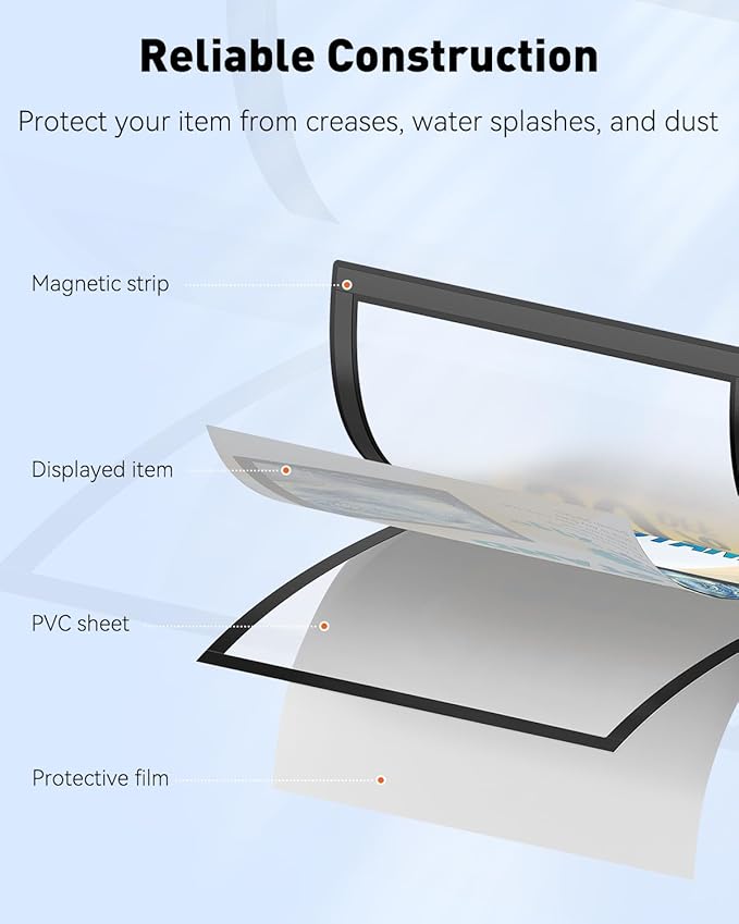 - Waterproof & Dust-Proof: Made of reliable PVC, the magnetic picture frame effectively prevents the displayed item from creases, water splashes, dust, and daily wear. The frosted finish resists scratches or fingerprints at all times for added protection