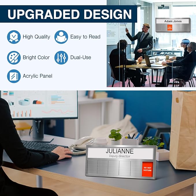 - Versatile Installation: Adjustable stand for desk display with anti-slip strips, plus adhesive strips for easy, residue-free door mounting. Perfect as a desk nameplate or office door sign.