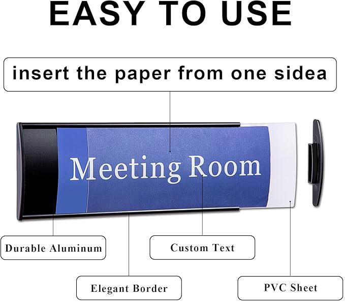 - EASY TO USE - You can write any text you want to display, such as name, title, room number, etc, then cut standard printing paper to the right size and then you need to insert the copy paper into the door sign holder from both sides, it professionally displays all information on door