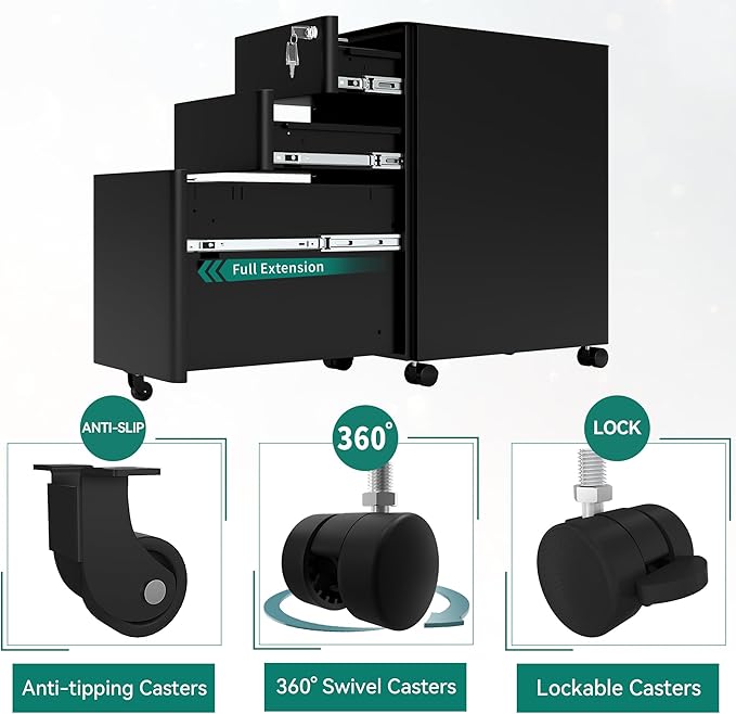 - Effortless Mobility: With five wheels, including an anti-tilt feature, the filling cabinet can be safely moved to any location; The four main wheels allow smooth mobility, making it simple to rearrange your office as needed