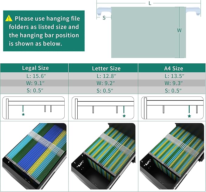 - Exceptional Storage Capacity: Maximize organization with our 3-drawer file cabinet; The bottom drawer is designed for A4, letter, and legal files, while the hanging rods are adjustable for your versatile storage requirements