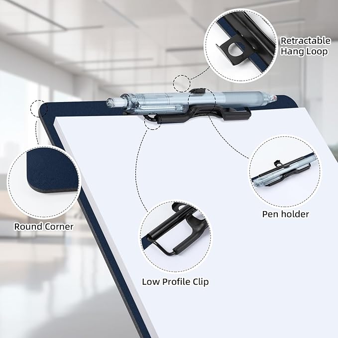 - Retractable Hanging Ring: The hanging clipboard has a retractable hanging ring on the top for easy access, you can hang it up to display the contents of your clipboard or hang it on the wall when not in use to save storage space. The low profile clip is ideal for stacked storage.