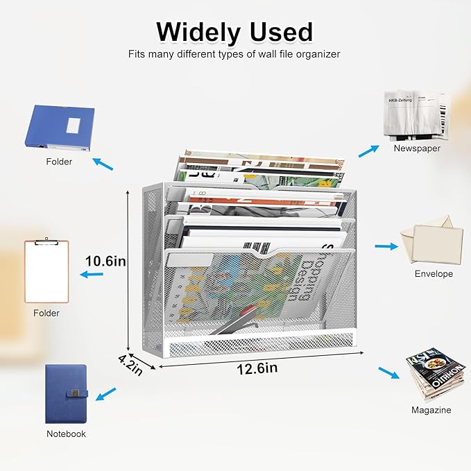 - 【Easy-to-Use Magnetic File Organizer】No installation required! This magnetic mesh file holder comes with screws for easy mounting on a wall, filing cabinet, or refrigerator. The dimensions of the hanging organizer are 12.6 x 4.2 x 10.6 inches, and the magnets are 11.8 x 2.8 inches in size. **Tip**: Before purchasing, be sure to measure the area where you plan to place it to ensure a perfect fit!