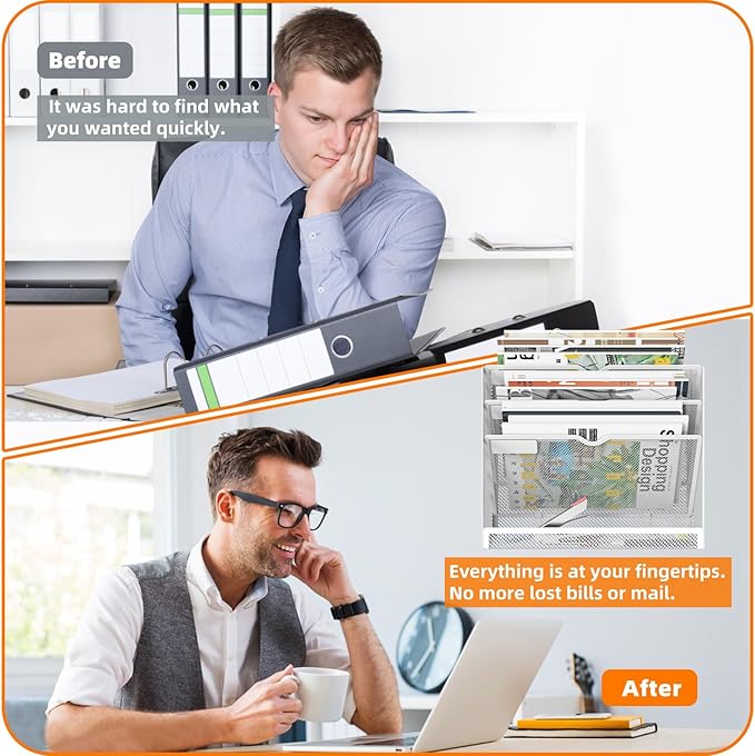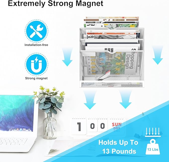 - 【Heavy-Duty Magnetic File Organizer】Designed to accommodate all your important files, folders, documents, and magazines with ease. Equipped with 3mm thick, ultra-strong magnets, this magnetic folder holder can support up to 13 lbs without budging. Even when fully loaded, it stays securely in place, thanks to its powerful magnetic backing. Built to last for years, it can handle heavy use and keep your documents safely organized without the risk of falling.