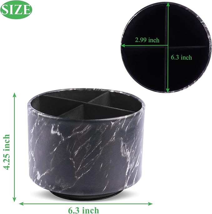 Round Leather Art Supply Organizer,Remote Control Holder,360-degree Rotating Pen Organizer with 4 Compartments(1-Marble Black Silver)