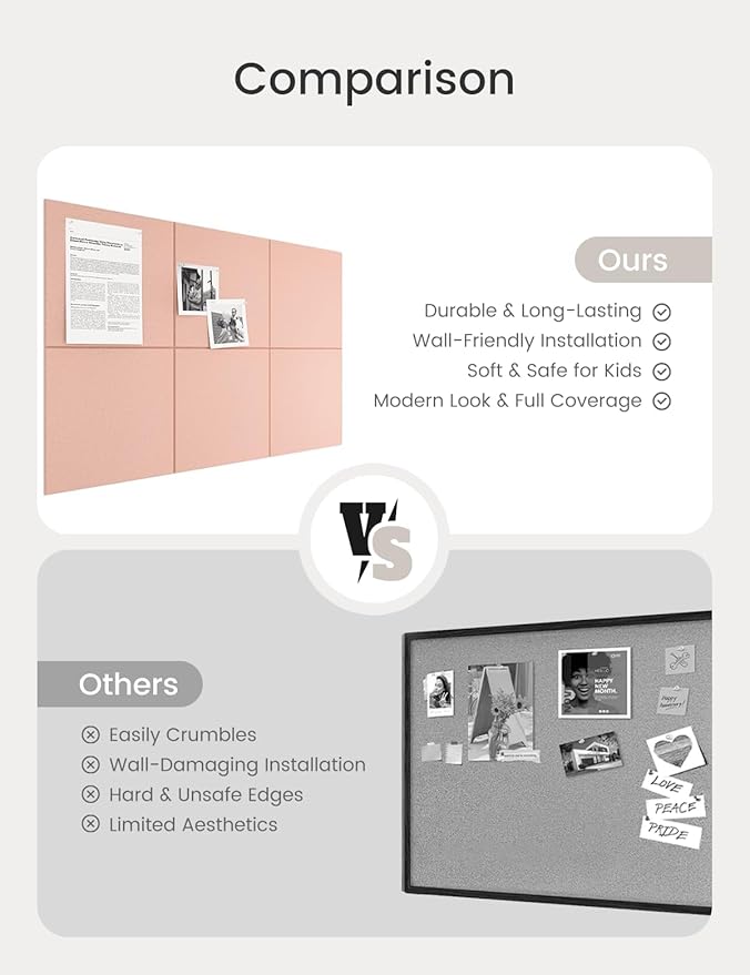 - 【Felt Bulletin Board – 6 Tiles Included】 Includes 6 felt cork boards (each 11.8" x 11.8") with 30 Pushpins that can be freely arranged into a large display board. Perfect for showcasing your schedules, ideas, and creations in home or office settings.