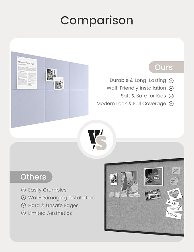 - 【Felt Bulletin Board – 6 Tiles Included】 Includes 6 felt cork boards (each 11.8" x 11.8") with 30 Pushpins that can be freely arranged into a large display board. Perfect for showcasing your schedules, ideas, and creations in home or office settings.