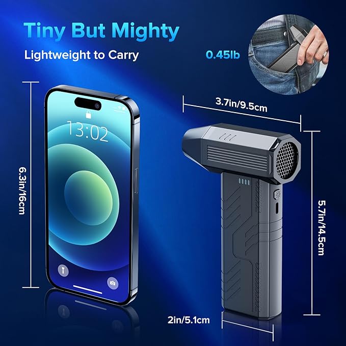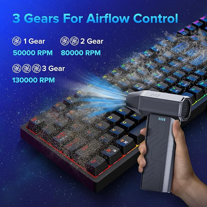 - Advanced Brushless Motor Design: Compressed air dusters come with the most advanced brushless motor, which is more cost but higher quality. This Electric Air Duster has a maximum speed of 130000 RPM motor with Stepless adjustable airflow settings, the maximum wind speed reaches to 55 m/s, equivalent to a category 4 hurricane. An 8000mAh battery gives you longer usage time.