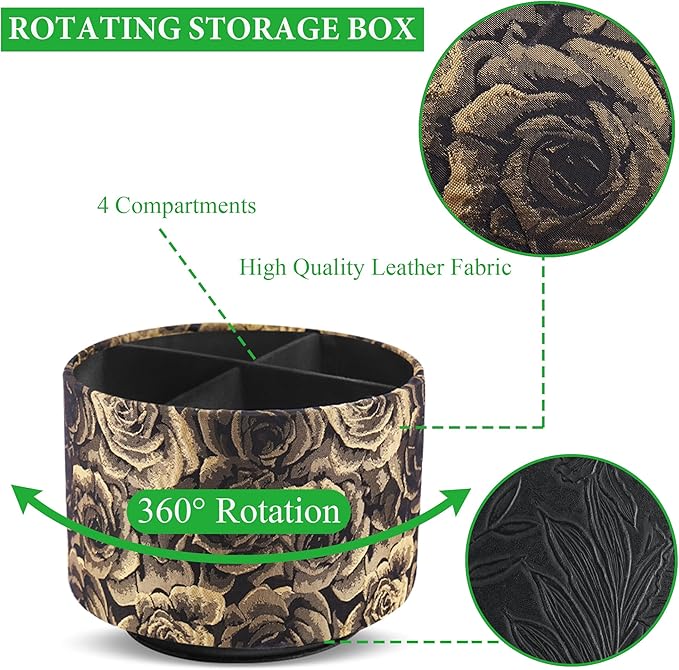 QIELIZI Round Leather Art Supply Organizer,Remote Control Holder,360 Degree Rotating,Multi-Functional Pencil Holder,4 Compartments Desktop Stationary Organizer(1-3D Rose Yellow)