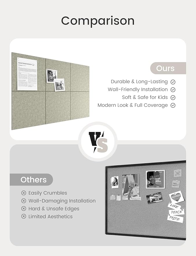 - 【Felt Bulletin Board – 6 Tiles Included】 Includes 6 felt cork boards (each 11.8" x 11.8") with 30 Pushpins that can be freely arranged into a large display board. Perfect for showcasing your schedules, ideas, and creations in home or office settings.