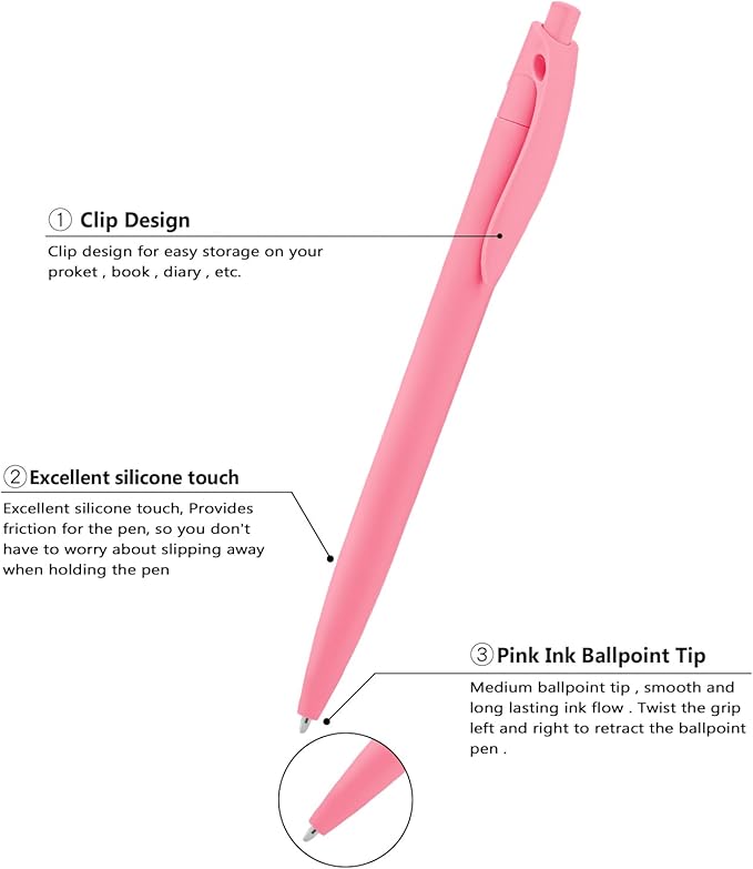 - 【Comfortable Touch】: The matte Pink ink shell of these click pens provides a smooth touch, providing a comfortable writing experience and is ideal for extended use.